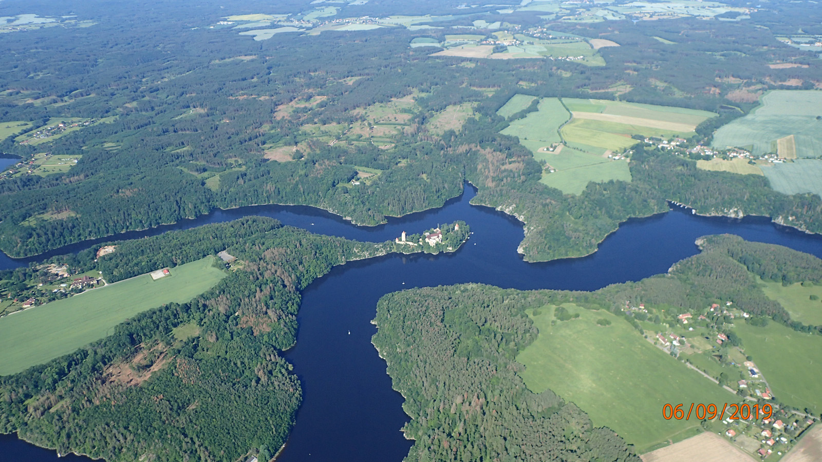 V úterý Marek opravoval za pomoci Karla a podařilo se mu stroj uschopnit . Počasí však nevěstilo na další dny nějaké zlepšení , spíše naopak a tak jsme řešili co dál . Po zkušenostech z pondělí jsme potřebovali stroje někde uschovat , protože se na nás hnala další bouřková oblaka . Karel začal obvolávat známé a nakonec nám domluvil zaparkování v Erpužicích u F. Herinka . Přelet z Hor se uskutečnil vzhledem k technickým záležitostem ve středu téměř v pravé poledne . Termika fungovala tak , že jsem za ten hodinový let pořídil jen asi 3 fotky jinak jsem musel být stále ve střehu a řídit. Hned po startu nad centrem Lokte nad Ohří se rogalo zatřáslo tak , že jsem se na chvíli ocitl asi 10cm nad sedačkou , protože pásy moc neutahuji a potom se naklonilo ostře doleva a chvíli trvalo než jsem to srovnal . Po hodinovém letu přistání v Erpužicích proběhlo už celkem bez problémů jenom Karel s Markem měli nějaké problémy s pořadím . Asi do půl hodiny přiletěl František s žákem a za necelou hodinu jsme byli už všichni bezpečně schováni v hangáru . Právě včas , protože začal zesilovat vítr a od Šumavy se začalo zase černat . V podvečer za námi přijeli Markéta a Martin , s kterými se známe z předchozích obletů , dovezli nám na večeři každému pizzu ( za což jim ještě jednou děkujeme a doufám , že jim to budeme mít možnost oplatit) a strávili jsme v jejich společnosti pěkný středeční večer . Počasí na další dny nevěstilo žádné zlepšení a tak bylo rozhodnuto , že čtvrtek , vzhledem k příznivému proudění vzduchu poletíme domů .